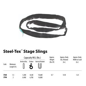 These lightweight round slings are ideal for easy and inconspicuous suspension of stage sound and lighting equipment. Black sleeve material helps the sling blend into its surroundings. The load-bearing member of our Steel-Tex round sling is made of galvanized steel aircraft cable wound in an endless configuration.