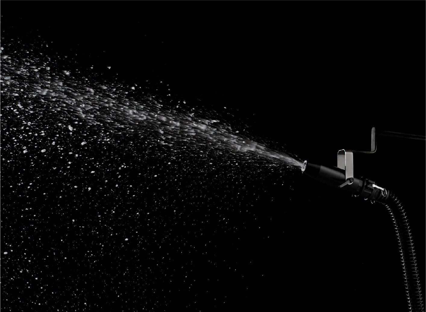 The nozzle is connected by a 10-Meter long hose and it can be easily rigged on a standard truss or tripod stand. Air and snow fluids are delivered to nozzle via the 10-Meter hose. Users can adjust the air volume and fluid flow rate to get the right snow effects needed, from fine snow to blizzards.