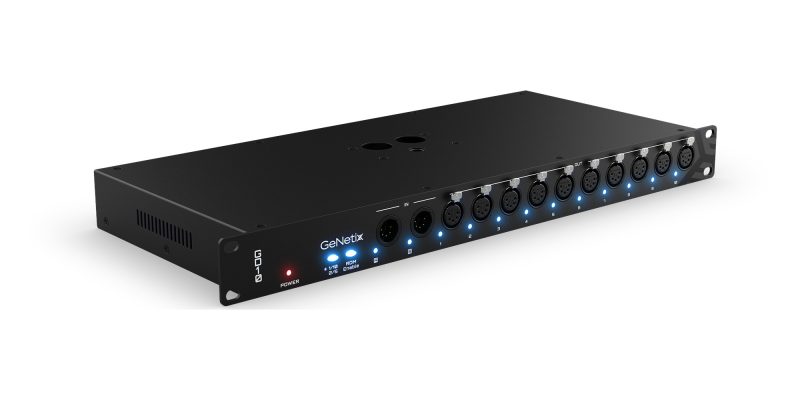 GeNetix GD10 is a 19″ 1U rack-mountable, RDM-capable 10-Port DMX Splitter at home in many different environments, with a design suited for both long-term installations and live events. Two selectable operating modes offer either 1×10 or 2×5 DMX signal distribution.