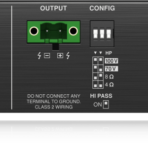 - Low-Z (4/8 Ohm) and High-Z (70/100 V) operation with switchable high-pass filter