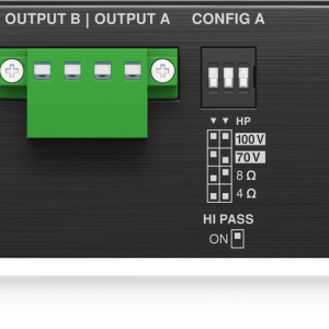Intuitive configuration of the flexible output channels is provided directly adjacent to the rear panel Euroblock output connector with dipswitches, which allow selection of 100 V, 70 V, 8 Ω, or 4 Ω operation. This configures both the maximum voltage of the output and the gain through the device. An individual control engages the built-in high-pass filter, which should be used on all constant voltage systems to avoid saturation on transformer-enabled loudspeakers and to help maintain sound integrity.