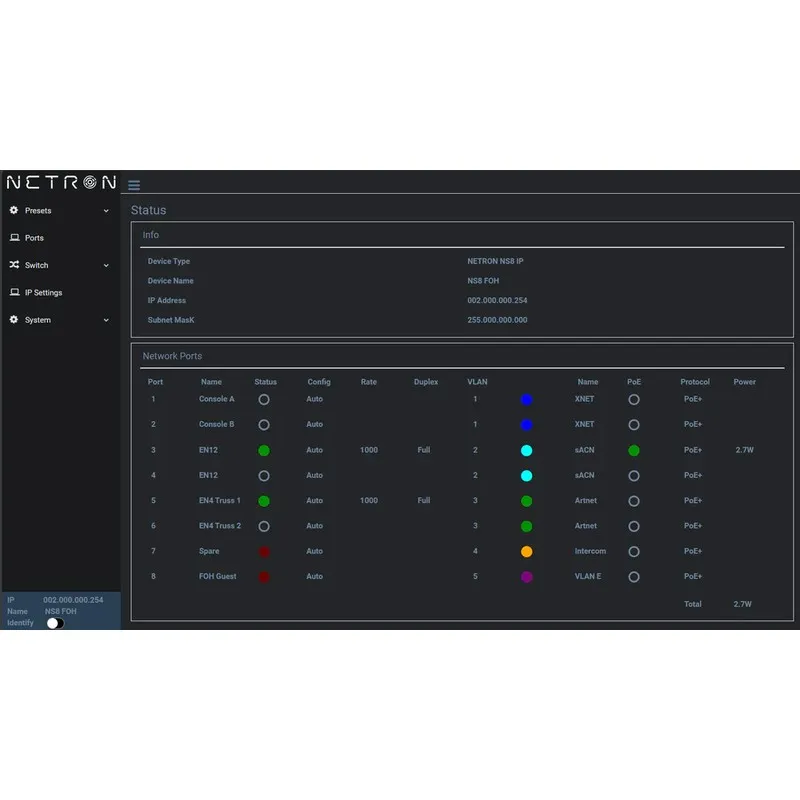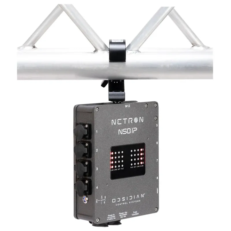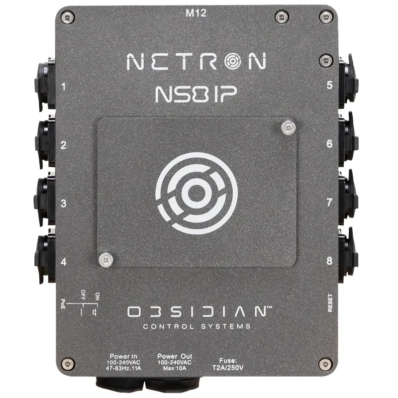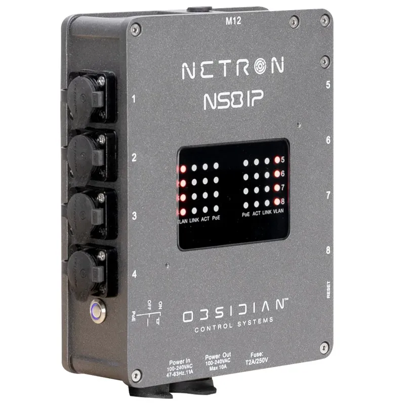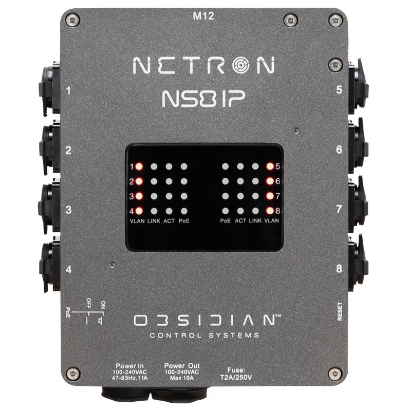 Brand: Obsidian ControlThe NETRON NS8 IP is a rugged, IP66-rated outdoor network switch featuring eight Gigabit ports with PoE+ support and a 100W total power budget, ideal for distributing data and power to NETRON nodes and other PoE devices.