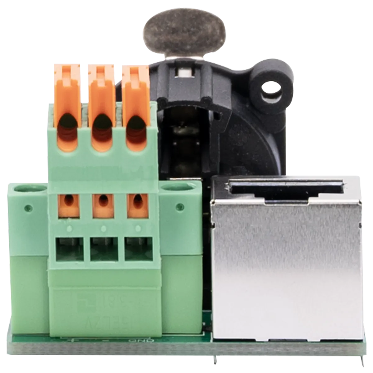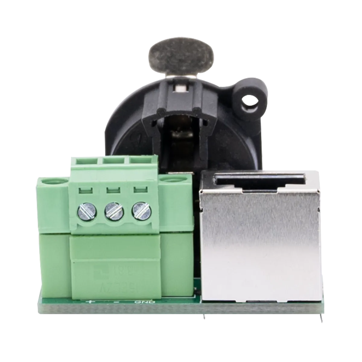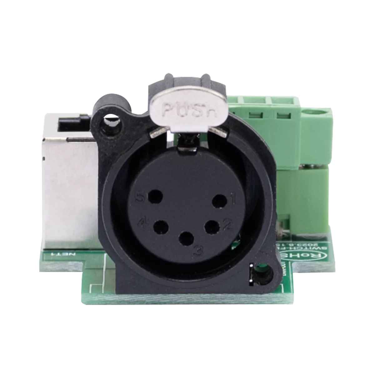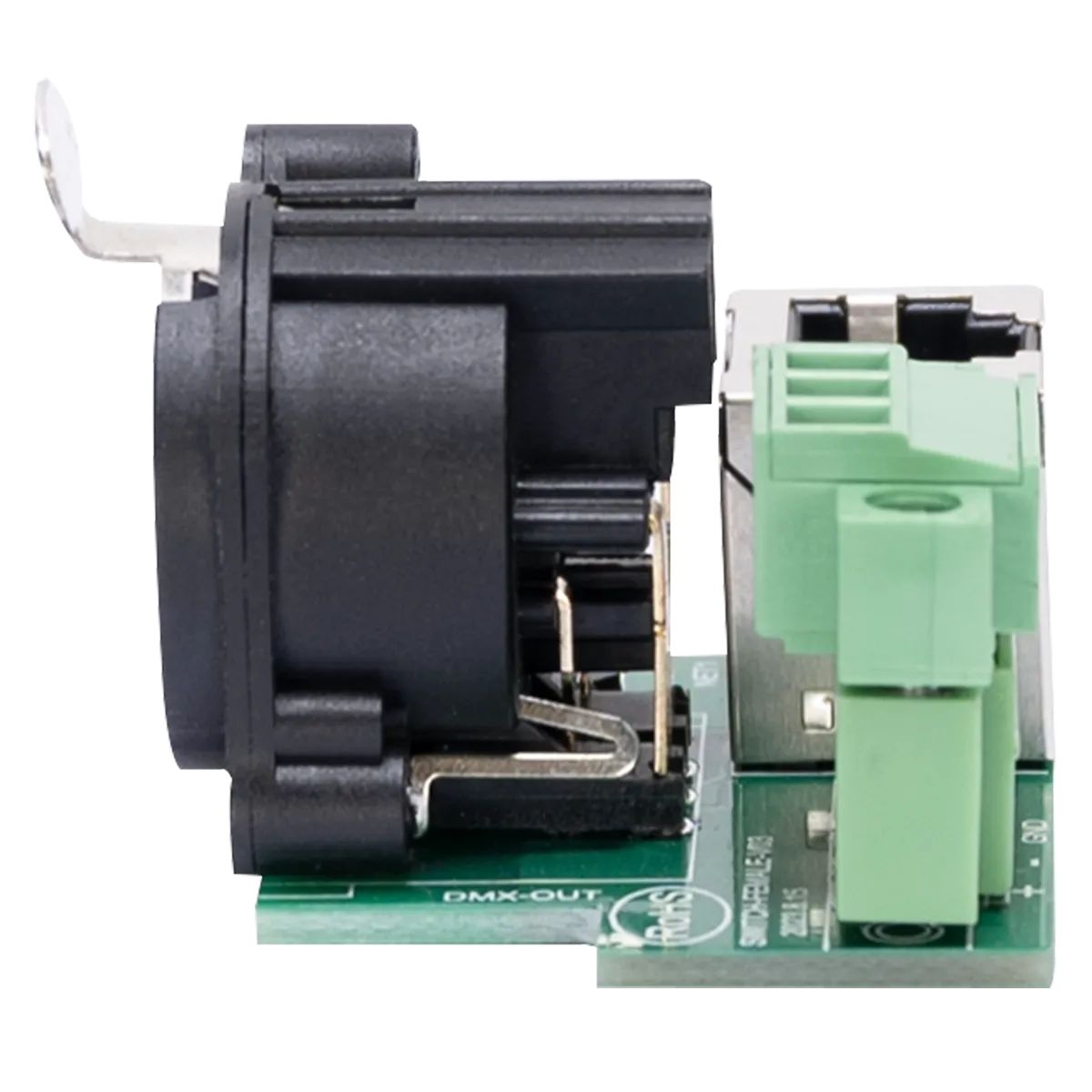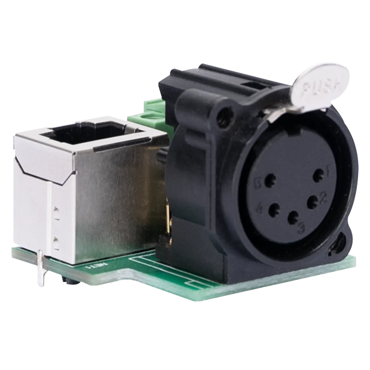Obsidian PCB5P: A-Size 5-pin DMX output connector on PCB, Inputs: 3-pin Phoenix, 3-pin IDC, and RJ45 (ESTA compliant DMX), Ideal for custom wall plates.