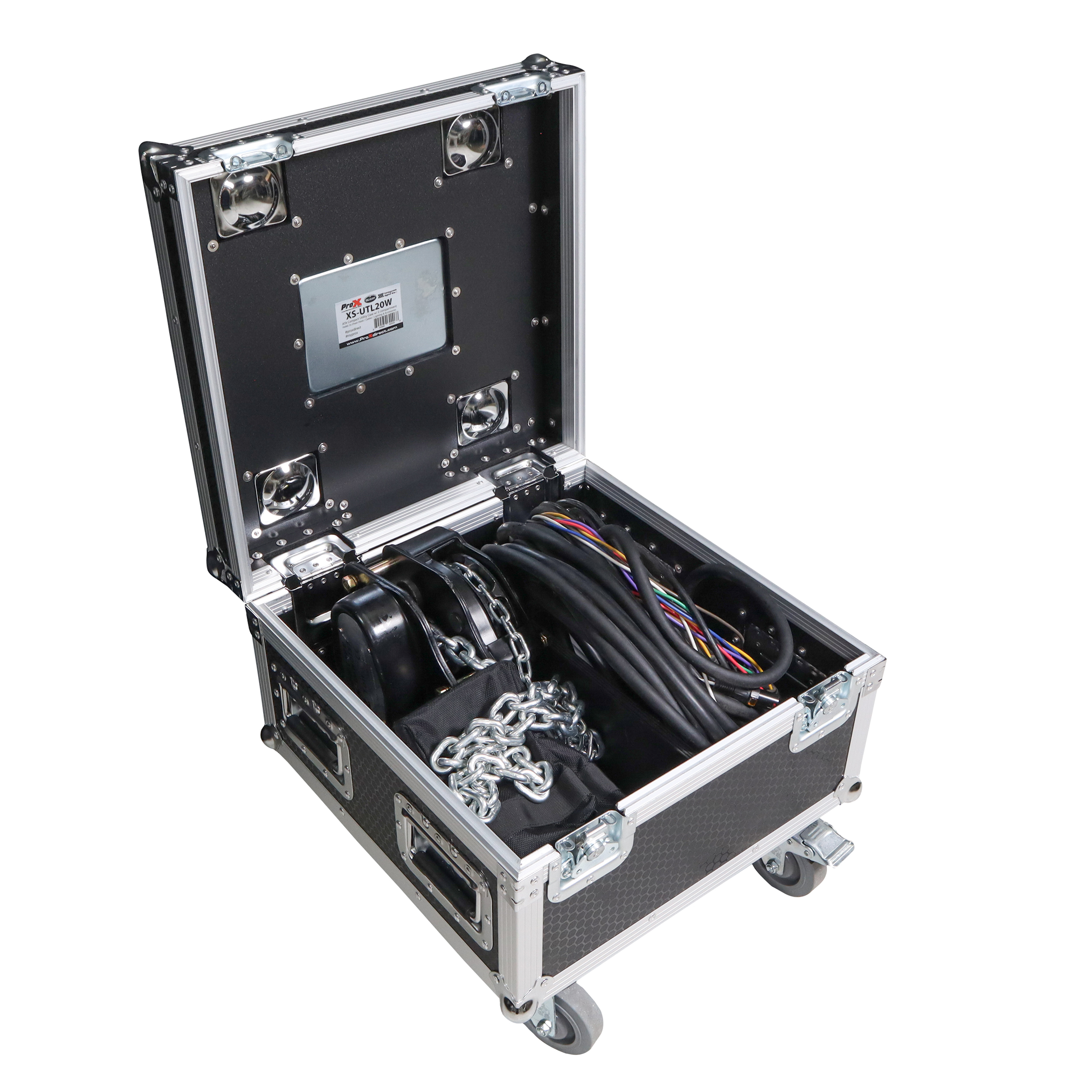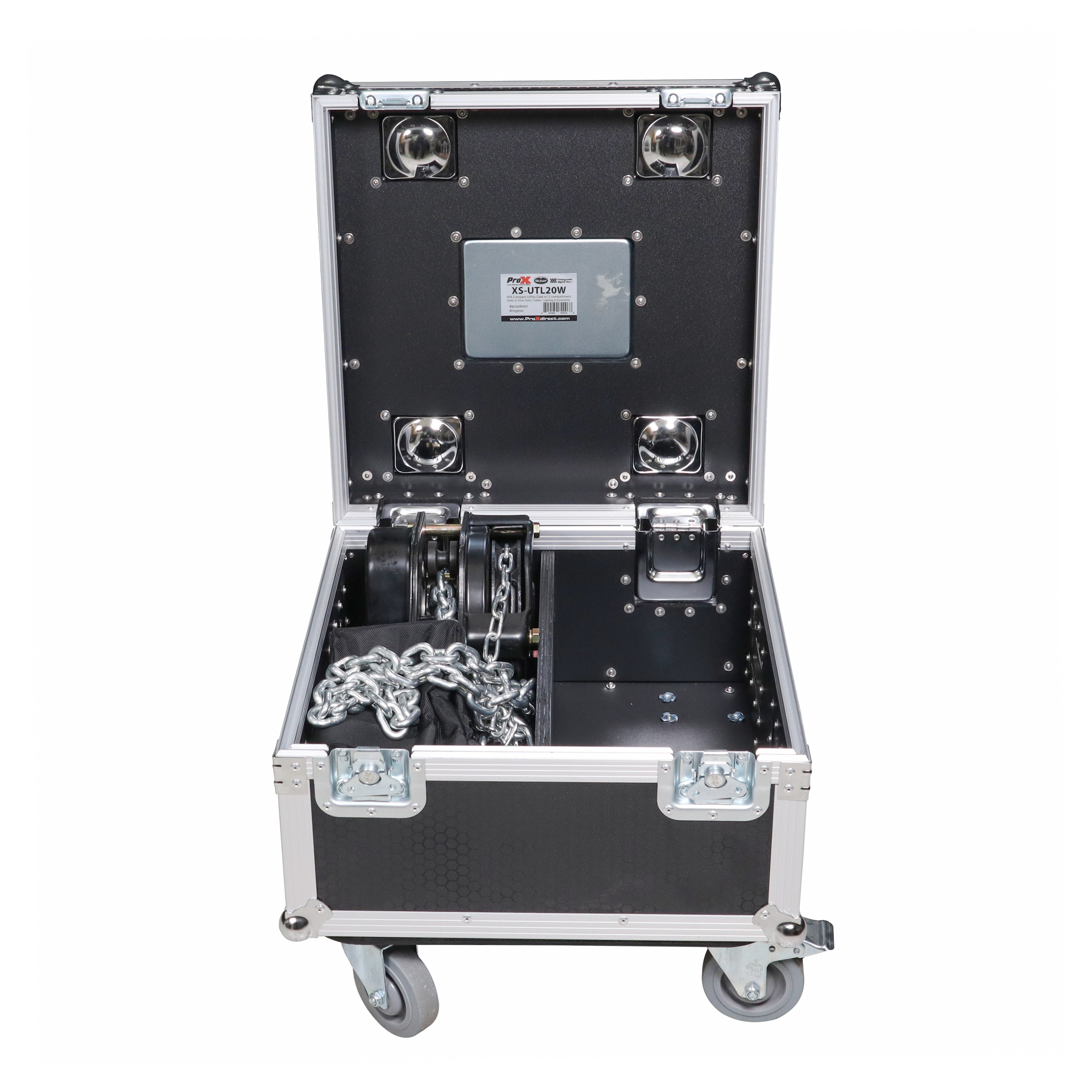 ProX XS-UTL20W ATA Utility Flight Travel Heavy-Duty Storage Road Case with 4×4″ in casters – 20 x 20 x 17″ Exterior. This heavy-duty ATA 300 Style Road Case is built to last a lifetime*, with its rugged 1/2″ plywood construction and high-quality materials and workmanship to give you the ultimate security for your gear This case with middle divider with 2 section of 18x9x9 is great to hold chain hoist. If you are passionate about your gear and want to keep it safe, this case will always perform at the highest level.